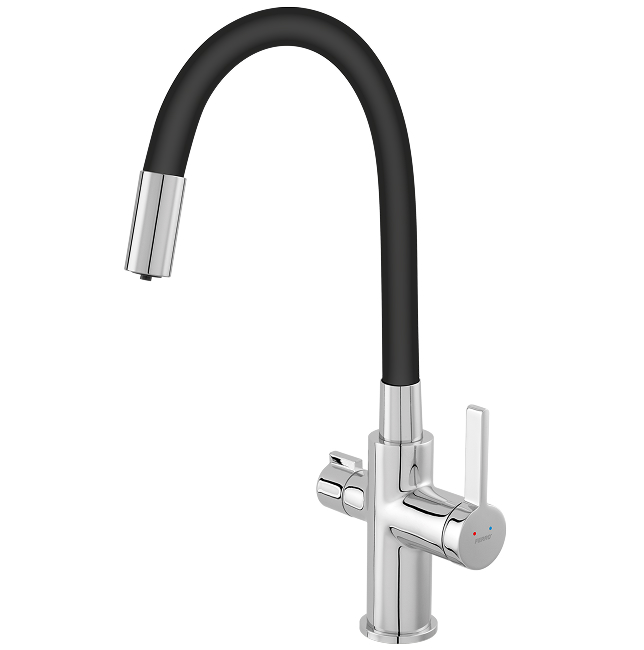 FILTRATA is a complete system that redefines ergonomics in a modern kitchen. At its heart is an advanced, dual-function kitchen mixer that allows the use of both domestic and filtered water without the need to install additional taps. The mixer is available in two stylistic variants: an elegant model in chrome with a swivel spout, or in modern matte black with a flexible spout.The set includes FERRO undersink filters, utilising activated carbon and nanosilver to reduce impurities and improve water taste. Depending on your needs, you can choose a cartridge with a lifespan of 6 months or a more efficient 12-month variant. The system is designed with complete freedom in mind – the FILTRATA mixer is universal and compatible with any other filtration system available on the market.